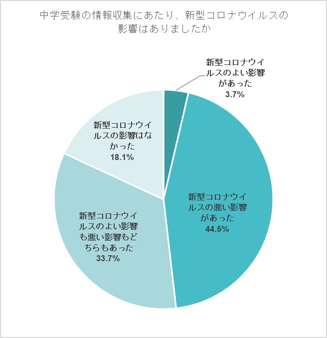 中学受験を経験した中学1年生~3年生の保護者に、中学受験の情報収集に、新型コロナウイルスの影響があったかを聞いたところ、8割超が「影響があった」と回答した。特に「悪い影響があった」と回答した人が44.5%ともっとも多かった。よい影響があった情報収集の手段は「中学校のホームページ」「塾からの情報」、悪い影響があった情報収集の手段は「中学校が開催する説明会や文化祭などのイベント」「複数の学校が集まる進学フェア」が多かった。また、コロナ下で役立った情報収集の手段は、「中学校のホームページ」「塾からの情報」のよい影響があったものだけでなく、悪い影響があった「中学校が開催する説明会や文化祭などのイベント」「複数の学校が集まる進学フェア」も3割以上の保護者が役立ったと回答した。