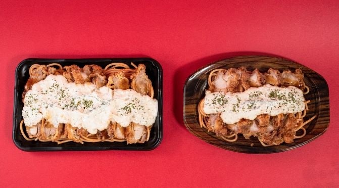 【内容】ジューシーな鶏唐揚げに、旨みのあるタルタルソース、甘酢ダレをトッピングしました。チキンもスパゲッティも、各種ソースもだいたい40%増量しました。
