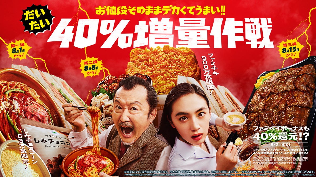 「40%増量作戦」は、2021年に、ファミリーマートの創立40周年にちなんでファミチキや惣菜、サンドイッチなどの人気商品を「お値段そのまま」で40%増量して発売し、お客さまにご好評をいただいた毎年実施しているキャンペーンです。第3回目となる今年は、「お値段そのままデカくてうまい!!だいたい40%増量作戦」と新キャンペーン名で開催し、人気のファミチキに惣菜やサンドイッチ、デザート、お菓子やパスタに加え、新たにパスタサラダもキャンペーン対象商品に加わり、全16種類の商品が週替わりで登場いたします。