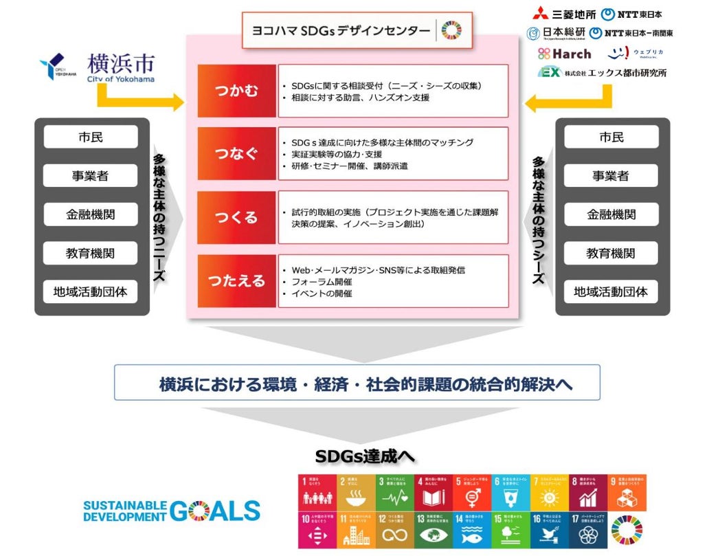 ヨコハマSDGsデザインセンターは、横浜市と民間事業者が共同で設立・運営する組織で、SDGsの達成に向けて、市内外の多様な主体が持つニーズとシーズをつなぎ合わせ、横浜における環境・経済・社会的課題を解決するための中間支援組織です。
