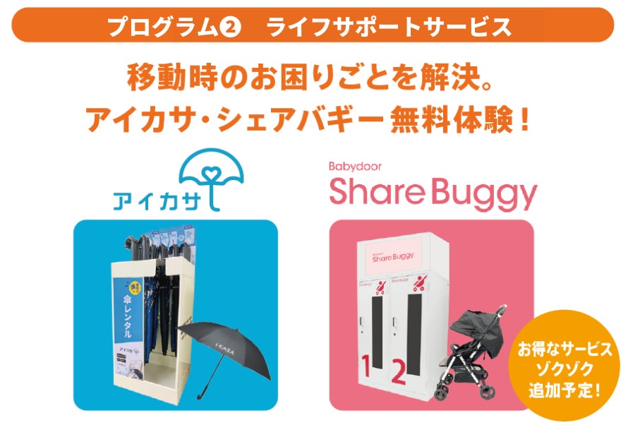 何かと荷物が多くなる子育て世代の小田急線利用をサポートするため、ベビーカーや傘などのシェアリングサービスを以下の条件で無料でご利用いただけるようにします。期間中、サービスは順次追加いたします。