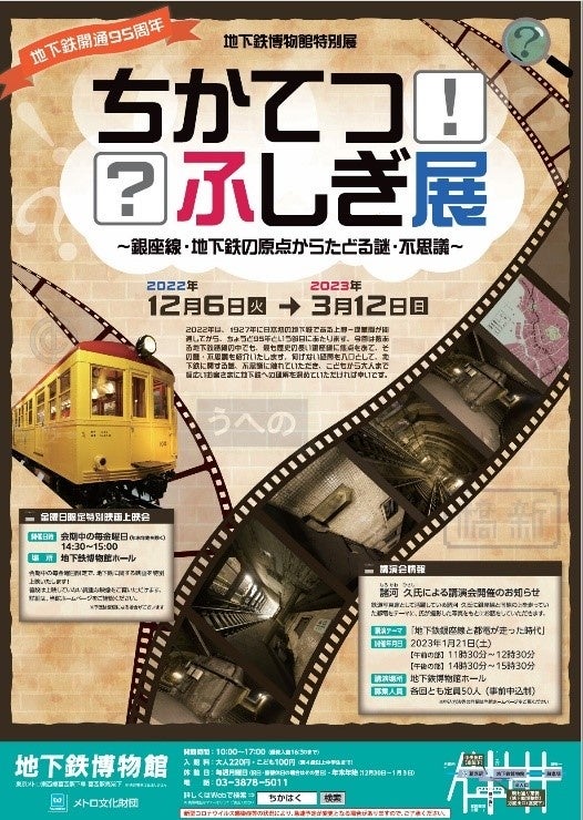 東京地下鉄株式会社(本社:東京都台東区 社長:山村 明義)では、公益財団法人メトロ文化財団(会長:奥 義光)が運営する地下鉄博物館において、2022年12月6日(火)~2023年3月12日(日)にかけて開催する特別展「地下鉄開通95周年 ちかてつふしぎ展~銀座線・地下鉄の原点からたどる謎・不思議~」に協力します。