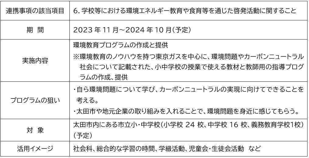 東京ガス株式会社(社長:笹山 晋一、以下「東京ガス」)は、このたび、太田市(市長:清水 聖義)、株式会社おおた電力(社長:木村 道幸、以下「おおた電力」)、太田都市ガス株式会社(社長:木村 道幸、以下「太田都市ガス」)と、「脱炭素のまちづくりに向けた包括連携協定」*1に基づき、太田市立小中学校への環境教育の提供に関する基本合意書を締結しました。