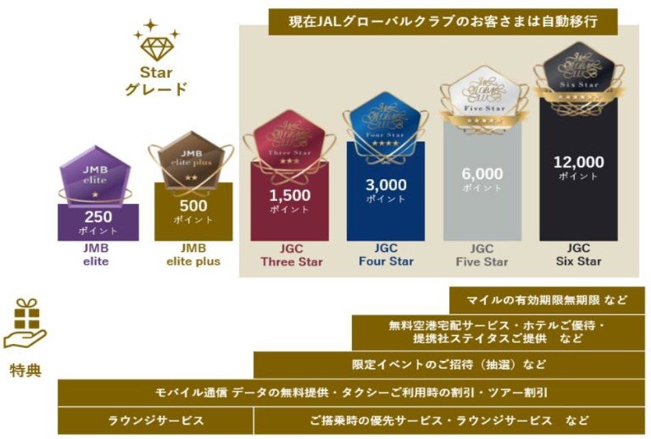 (*)JAL Life Status プログラムは、対象サービスのご利用実績に応じて積算される生涯実績ポイントである「Life Status ポイント」の総保有数に応じ「JALグローバルクラブへの入会資格」や「Star グレード」をご提供するプログラムです。「Life Status ポイント」はマイルとは異なり、特典交換などにはご利用いただけません。