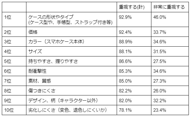- 1位「ケースの形状やタイプ」92.9%、2位「価格」92.4%、3位「カラー」88.9%。