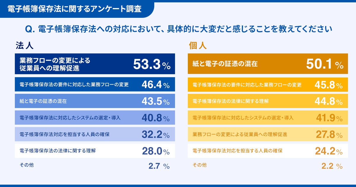 ・法人は「従業員への理解促進」を、個人事業主は「紙と電子の混在」を懸念