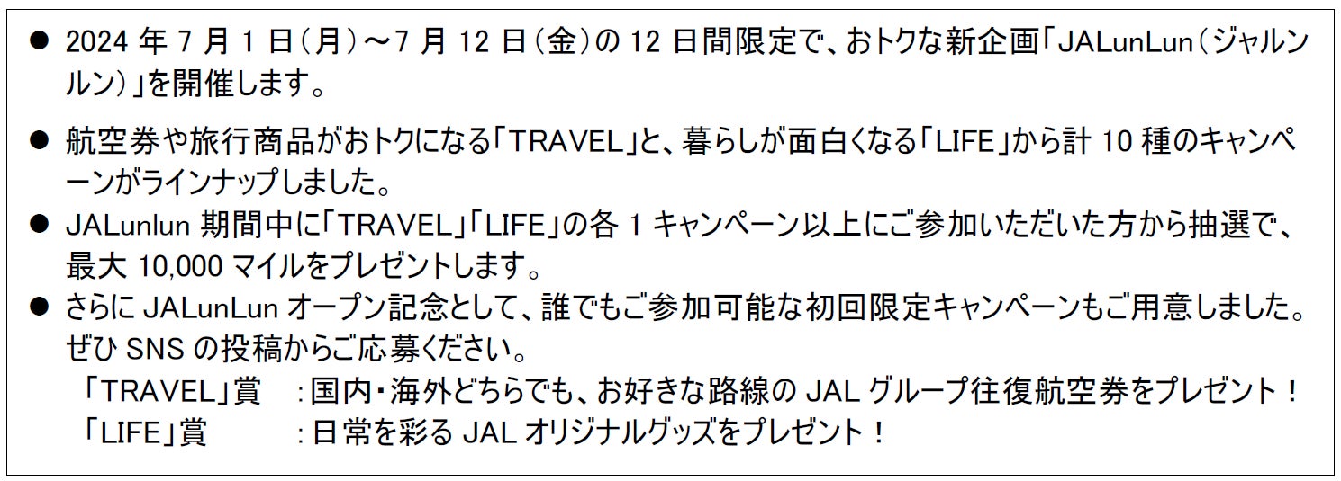 JALは、2024年7月1日(月)から12日(金)にかけて、新しいキャンペーン「JALunLun(ジャルンルン)」を開催します。