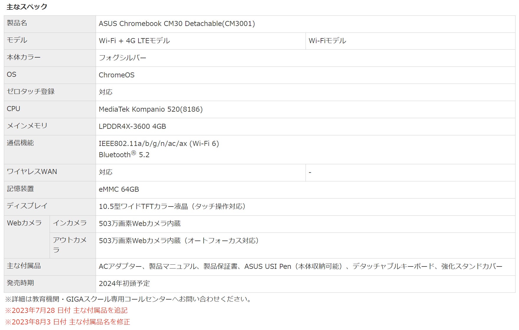 ASUS JAPAN株式会社は本日、教育機関・GIGAスクール向けChromebookシリーズより「ASUS Chromebook CM30 Detachable(CM3001)」(以下、CM3001)の計1製品2モデルを発表しました。CM3001は堅牢さと持ち運びやすさを兼ね備えた、通学に適した2-in-1 ノートPCです。10.5型のタッチパネルディスプレイ、脱着可能なキーボード、強化スタンドカバー、本体収納が可能なスタイラスペンが一台に収まっているので、用途に合わせて多様なスタイルでご使用いただけます。キーボードを取り外してタブレットスタイルで使用したり、スタイラスペンでメモを書き留めたりすることができるため、グループワークや自宅学習など多種多様な学習環境に合わせて柔軟に使用することができます。今回発表したモデルのうち1つは4G LTEに対応し、Wi-Fi環境を気にすることなく高速モバイル通信が可能です。本製品の発売日や価格などの詳細については、教育機関・GIGAスクール専用コールセンターまでお問い合わせください。