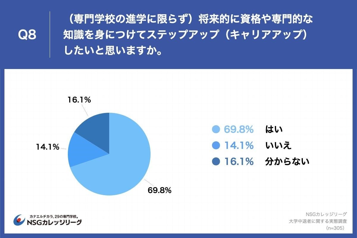 「Q8.(専門学校の進学に限らず)将来的に資格や専門的な知識を身につけてステップアップ(キャリアアップ)したいと思いますか。」(n=305)と質問したところ、「はい」が69.8%、「いいえ」が14.1%という回答となりました。