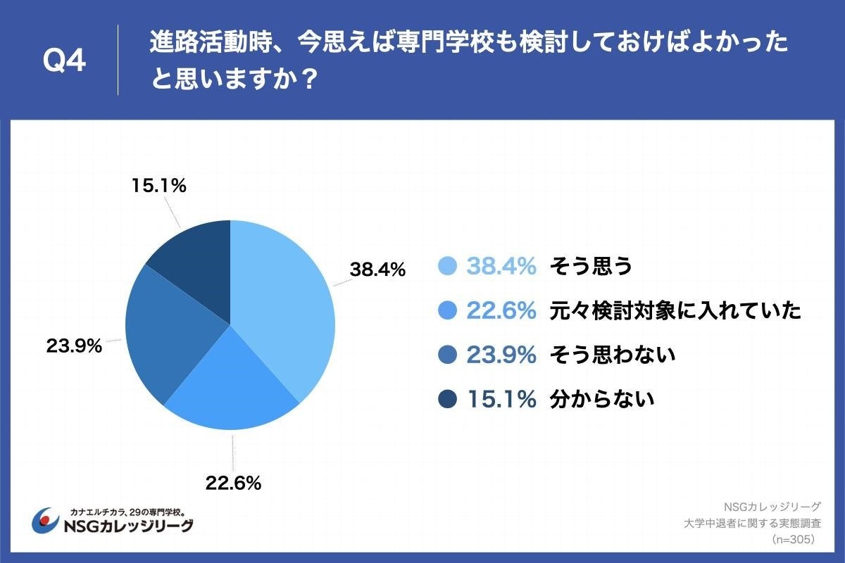 「Q4.進路活動時、今思えば専門学校も検討しておけばよかったと思いますか?」(n=305)と質問したところ、「そう思う」が38.4%、「元々検討対象に入れていた」が22.6%という回答となりました。