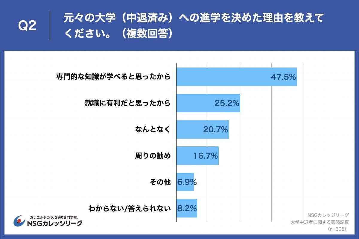 「Q2.元々の大学(中退済み)への進学を決めた理由を教えてください。(複数回答)」(n=305)と質問したところ、「専門的な知識が学べると思ったから」が47.5%、「就職に有利だと思ったから」が25.2%、「なんとなく」が20.7%という回答となりました。
