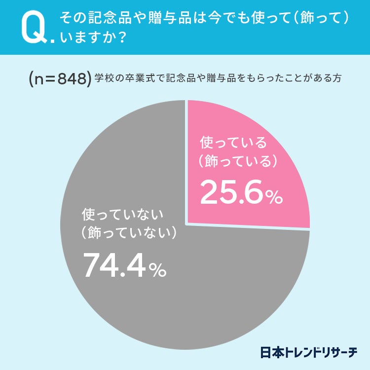 25.6%の方が、学校の卒業式でもらった記念品や贈与品を「まだ使っている(飾っている)」と回答しています。