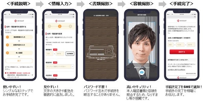 今回、日本生命では、全国の銀行等提携金融機関から加入した顧客の住所・電話番号の変更手続きに本サービスが活用されます。スマートフォンで撮影された保険加入者自身の顔写真(以下、「セルフィ―」)と本人確認書類で認証を行うため、パスワードの入力が不要となります。さらに保険加入者が記入間違いや手順の迷いなくスムーズに手続きができるように、スマートフォン版サイトをUI/UX※1に配慮したデザインを採用し、視認性・操作性を高めることでオンライン手続きの簡便化を目指します。