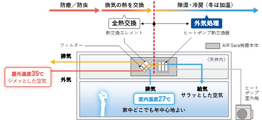 本システムは、除湿機能を搭載した第1種換気方式(全熱交換器付き)の24時間換気システムです。外気を室温に近づけて給気する全熱交換に加え、除湿や温度調節による外気処理を行います。