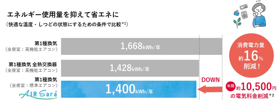 快適な温度・湿度(しつど)の状態にするための条件下でのエネルギー消費量は、第3種換気比で約16%削減を実現しました。