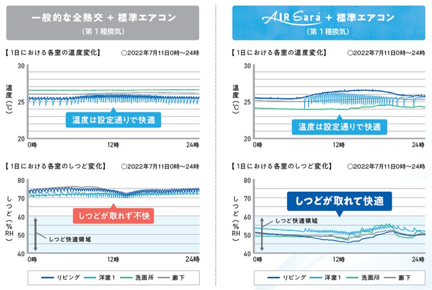 ※【測定条件】実証住宅、住戸面積:72.46[m2]、UA値0.87[W/m2・K]、外気条件:温度22.8~30.8℃、平均相対湿度77.5%、標準エアコン設定:夏季温度設定冷房27℃(再熱除湿機能なし)AIR Saraの設定:自動運転モード、内部発熱・発湿なし、目標目安:温度28℃以下、相対湿度40~60%