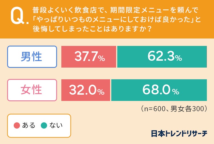 男性の37.7%、女性の32%%が、期間限定メニューを頼んで「やっぱりいつものメニューにしておけば良かった」と後悔してしまったことが「ある」と回答しています。