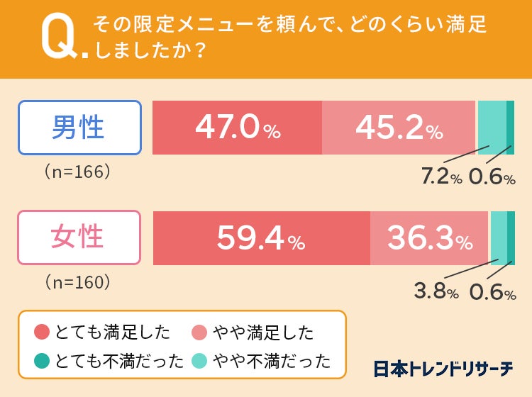 さらに男女共に9割以上の方が「期間限定メニューを頼んだことで満足した」と答えていました。