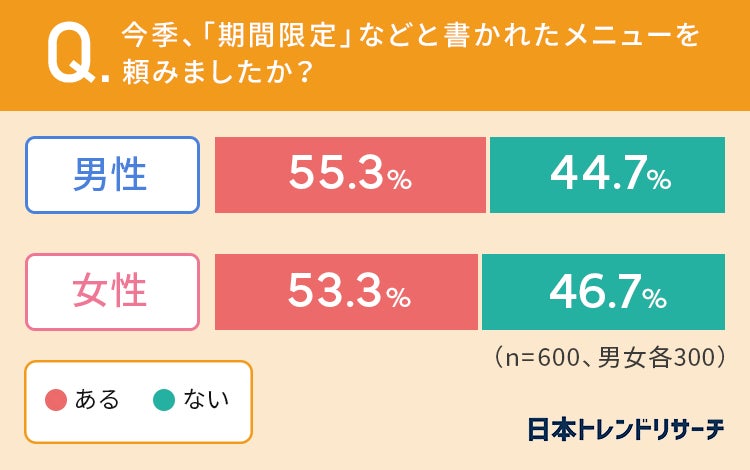 男女ともに半数以上の方が、今季「期間限定」などと書かれたメニューを頼んだと回答しています。