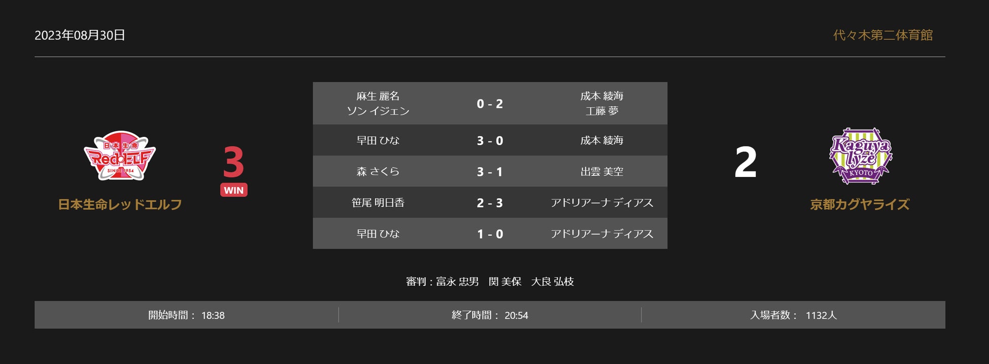 ノジマTリーグ 2023-2024シーズン 公式戦 8月30日開催 日本生命レッドエルフ vs 京都カグヤライズ の対戦は、3-2で日本生命レッドエルフが勝利しました。