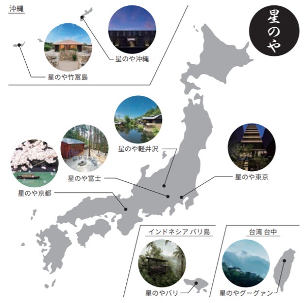 「その瞬間の特等席へ。」をコンセプト に、各施設が独創的なテーマで、圧倒的非 日常を提供する「星のや」。国内外に展開 する各施設では、その土地の風土、歴史、 文化が滞在時間を豊かにするものとしてお もてなしに織り込み、訪れた人を日々の時 間の流れから解き放ち、特別な非日常へい ざないます。