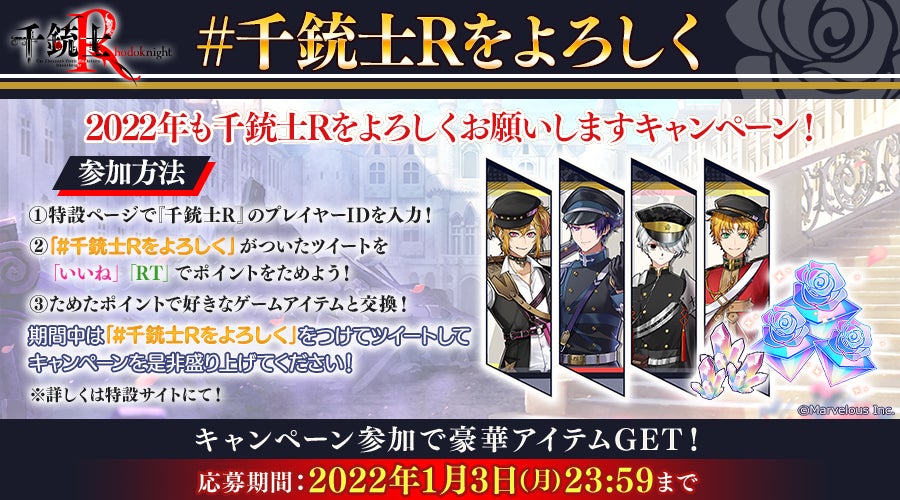 株式会社マーベラス(代表取締役社長 許田周一/所在地:東京都品川区)による、『千銃士』プロジェクトの完全新作スマートフォンゲーム『千銃士:Rhodoknight』(読み:せんじゅうし ろーどないと 以降、『千銃士R』)は、Twitterにてゲーム内の豪華報酬がもらえる「2022年も千銃士Rをよろしくお願いしますキャンペーン!」を開始いたしました。