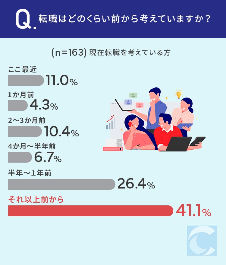 41.1%の方が「1年以上前から」転職を考えていると回答していました。