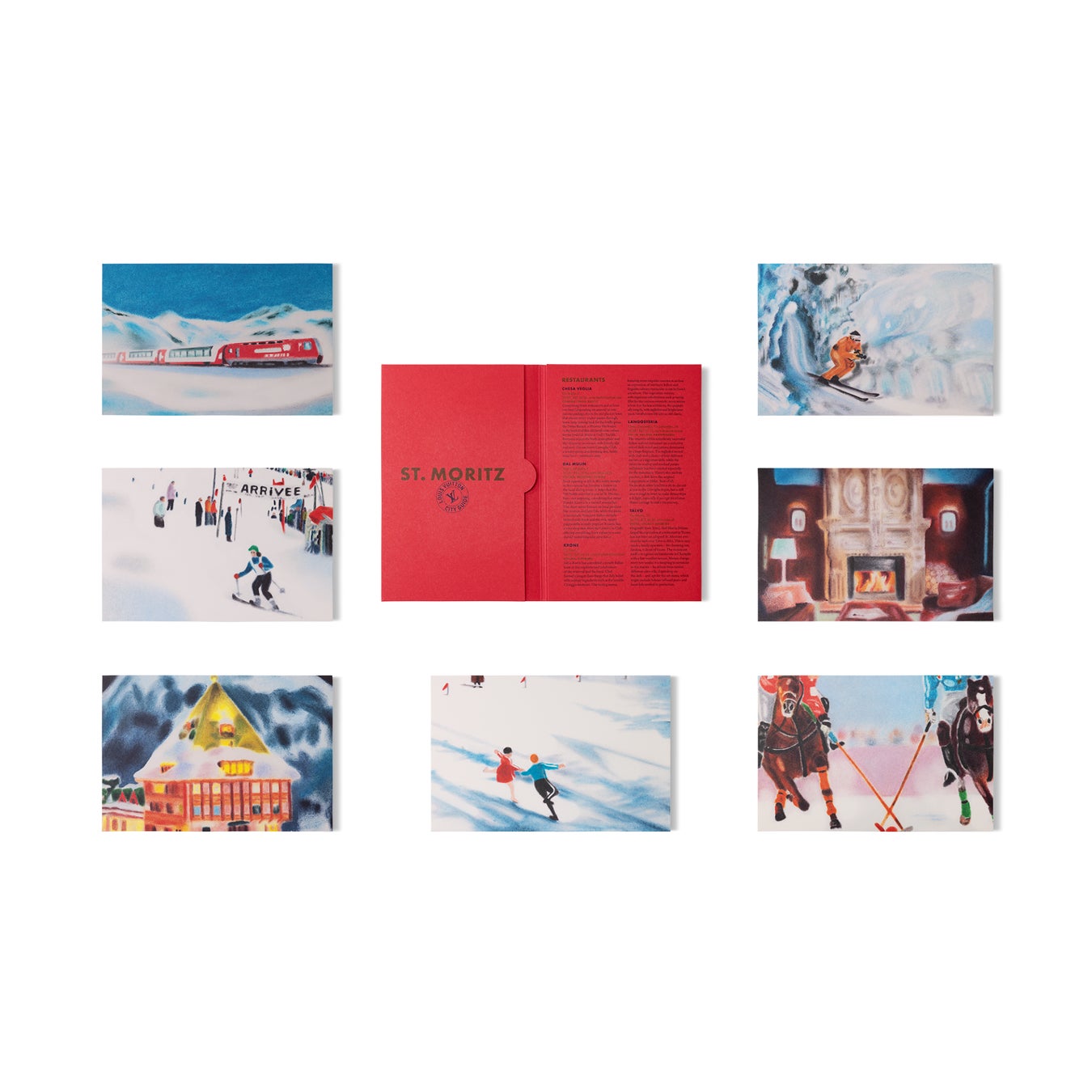 冬にぴったりの、厳選されたウィンターリゾートのクールシュヴェル、コルティーナ・ダンペッツォ、アスペン、クシュタート、サン・モリッツ、そして初登場のキッツビューエルとクラン=モンタナにフォーカスし、各地の必見スポットをご紹介するエクスクルーシブなボックスセットを刊行。ゲストイラストレーターとして起用されたトム・オゴマ、サラ・マゼッティ、ヨヘン・ゲルネール、シモン・バイイ、リザ・ムシェ、ジャコモ・ナンニ、そしてファニー・ブランらが、各地のスキーリゾートを1ヶ所ずつ担当し、独自のビジョンを表現しました。