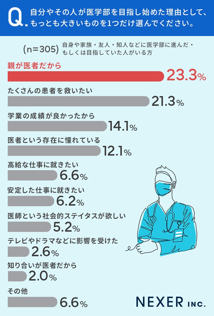 「親が医者だから」が23.3%、「たくさんの患者を救いたい」が21.3%という結果となりました。