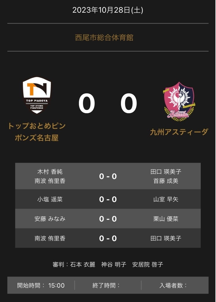 ノジマTリーグ 2023-2024シーズン 公式戦 10月28日開催 トップおとめピンポンズ名古屋 vs 九州アスティーダ オーダー発表