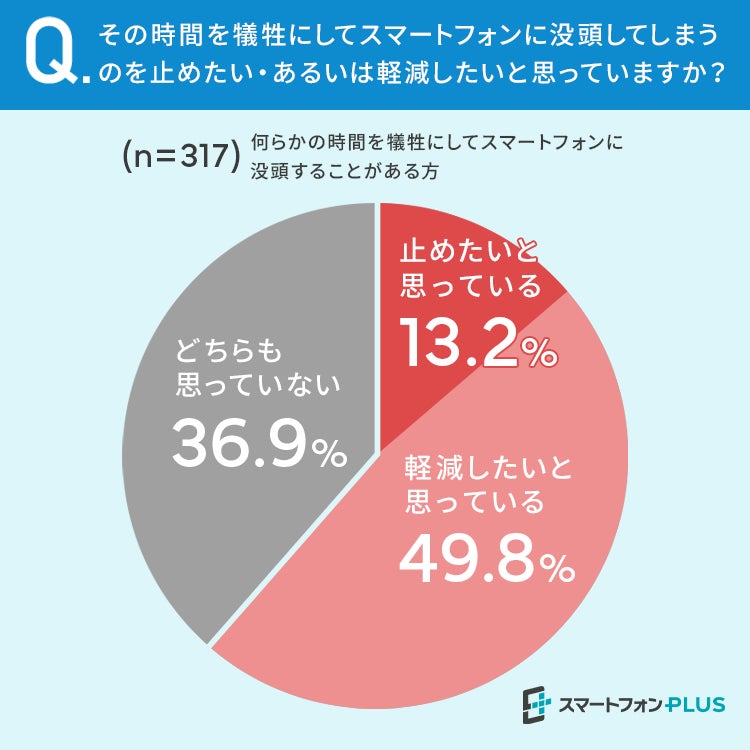 合計で63.1%の方が、時間を犠牲にしてスマートフォンに没頭してしまうのを止めたい・あるいは軽減したいと思っている、と回答しています。