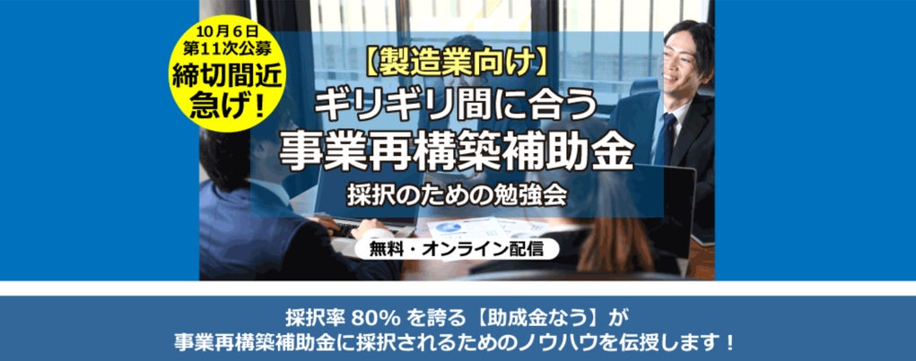 【製造業向け】ギリギリ間に合う 事業再構築補助金 採択のための勉強会(無料/オンライン)【助成金なう】