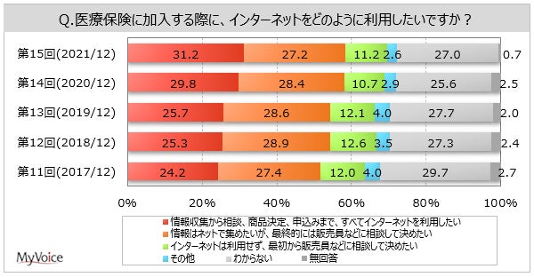 ■医療保険加入時、「情報収集から申し込みまで、すべてインターネットを利用したい」が3割強で2019年以降増加。「ネットで情報収集、最終的には販売員などに相談」が3割弱