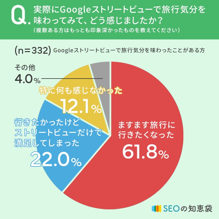 61.8%が「ますます旅行に行きたくなった」と回答している一方で、22%が「行きたかったけどストリートビューだけで満足してしまった」と回答していました。