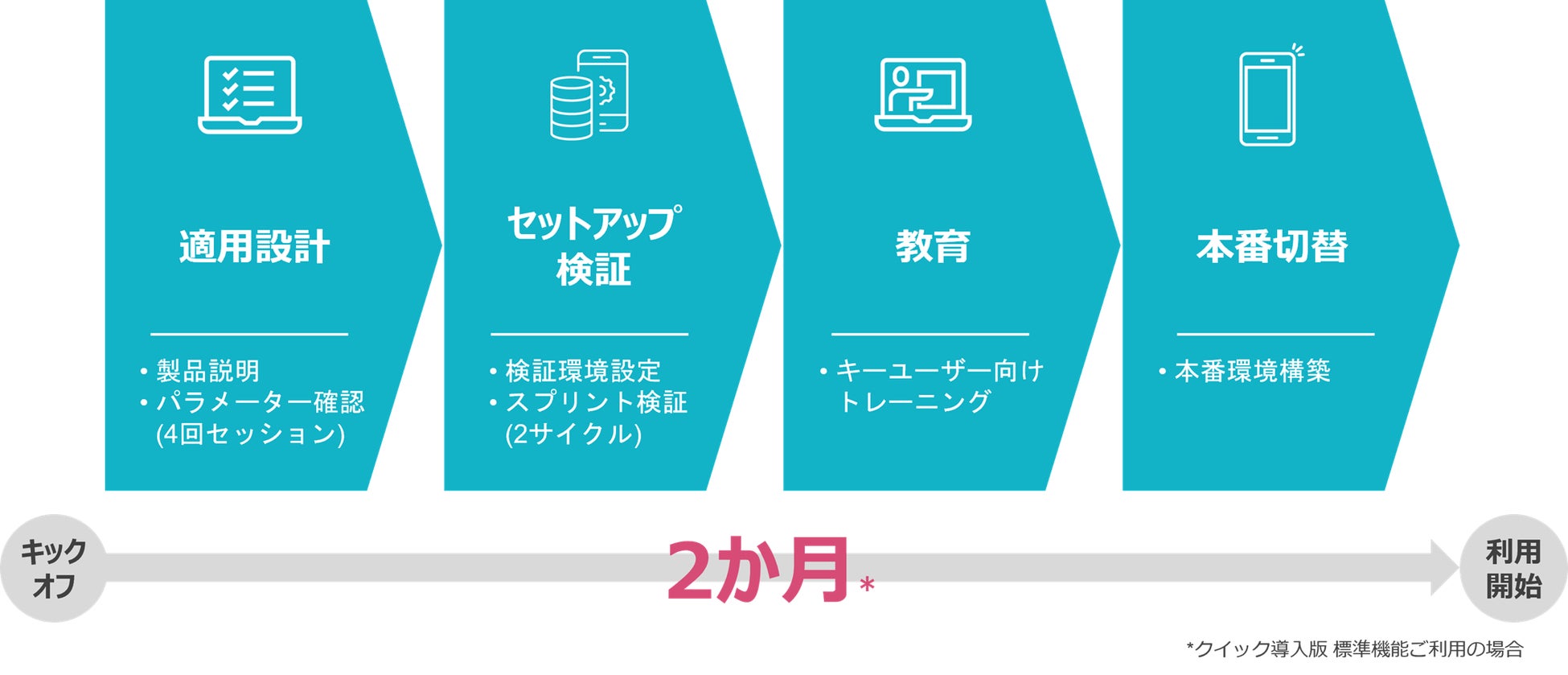 「Spendiaクイック導入版」の導入には、システム適用の設計からセットアップ、ユーザー向けトレーニングをオンラインにより実施し、2か月での利用開始を実現します。