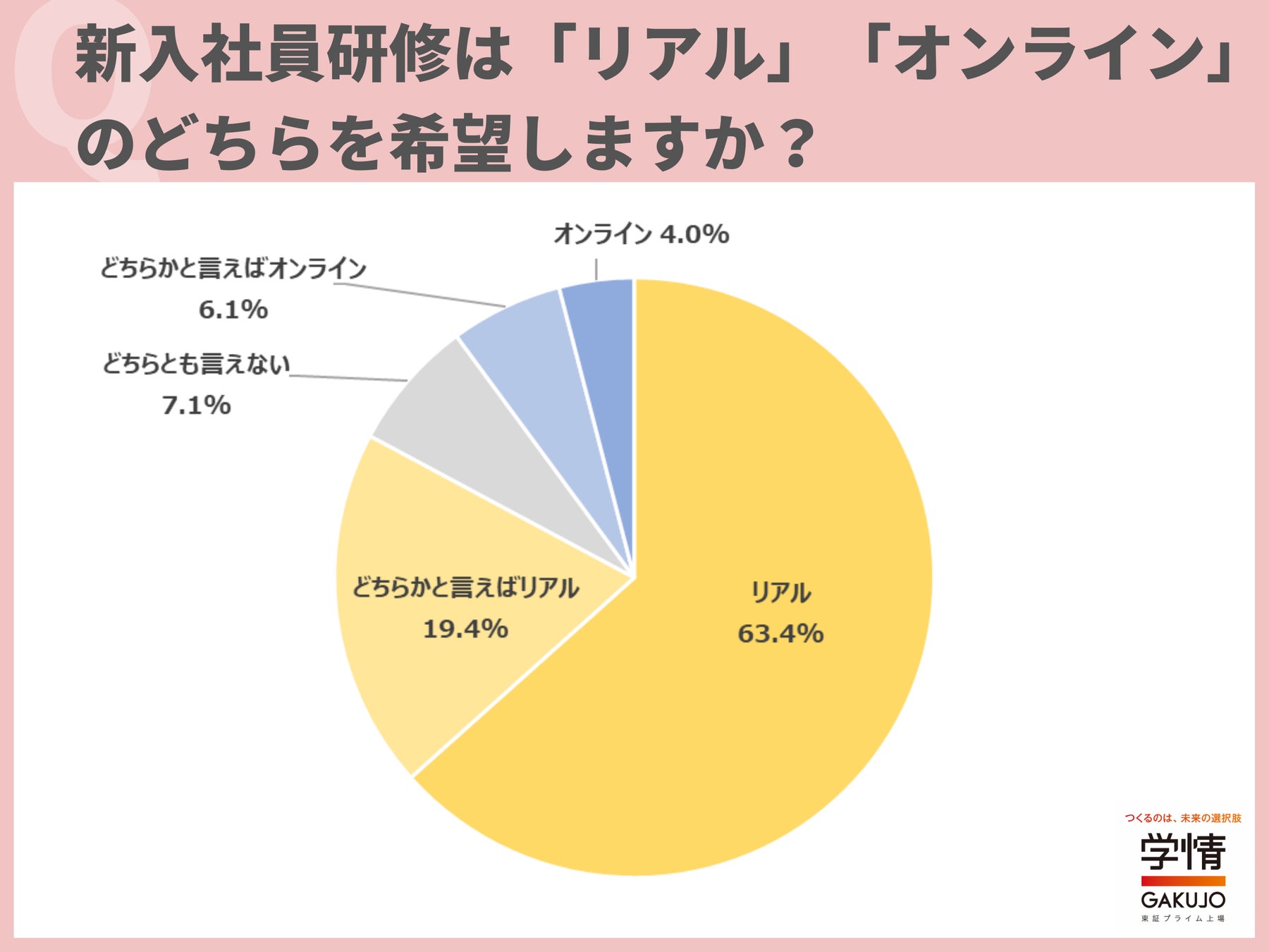 新入社員研修は「リアル」で参加したいと回答した新入社員が63.4%に上りました。「どちらかと言えばリアル」19.4%を合わせると、8割以上の新社会人が「リアル」での参加を希望していることが分かります。「オンライン」での参加を希望する新社会人は10.1%でした。