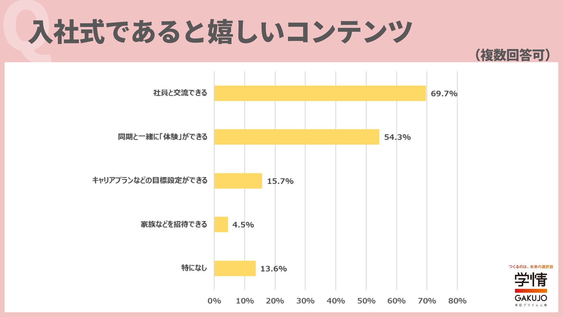 入社式であると嬉しいコンテンツは、「社員と交流できる」が69.7%で最多。次いで、「同期と一緒に『体験』ができる」54.3%、「キャリアプランなどの目標設定ができる」15.7%が続きました。「これからお世話になる社員の方と直接お話したい」「社員と直接お話し、目標となる先輩を見つけたい」「同期と親睦を深めたい」「まだ同期と仲良くなれていないので『同じ体験』をして交流を深めたい」「何か一緒に体験したり、共同作業をすると思い出に残ると思う」などの声が上がっています。