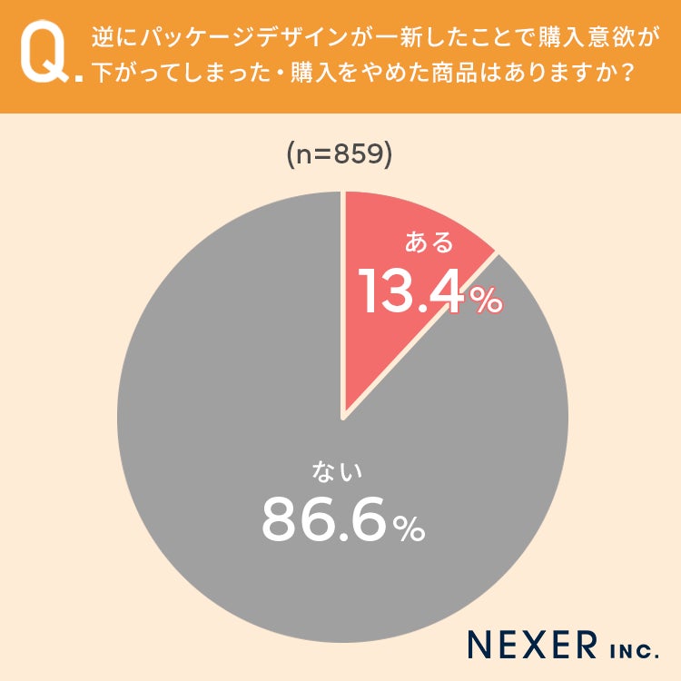 13.4%の方が、逆にパッケージデザインが一新したことで購入意欲が下がってしまった・購入をやめた商品が「ある」と回答しています。