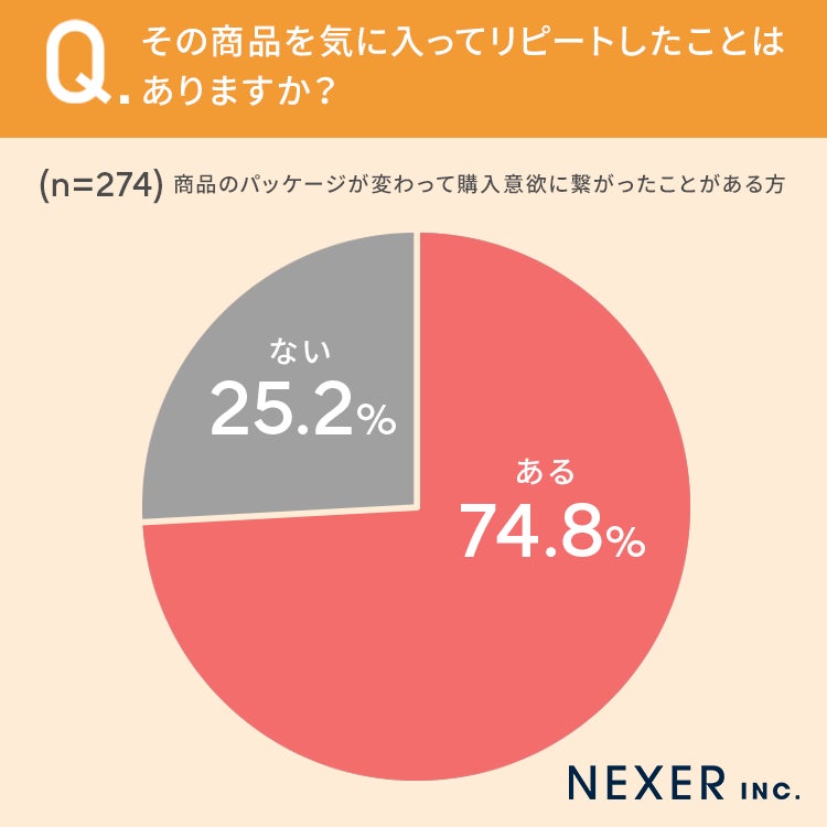 74.8%の方がパッケージデザインが変わったことで購入した商品を、気に入ってリピートしたことが「ある」と回答しています。