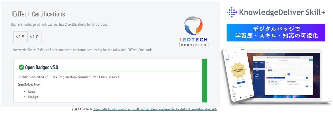 導入実績2000超を誇るeラーニング専門ソリューション企業、株式会社デジタル・ナレッジ(本社:東京都台東区、代表取締役社長:はが弘明)が提供するデジタルバッジシステム『KnowledgeDeliverSkill+(ナレッジデリバースキルプラス)』は、1EdTech Consortium Inc.(以下、1EdTech)より、オープンバッジ3.0 Displayerの認定を日本で初めて取得しました。