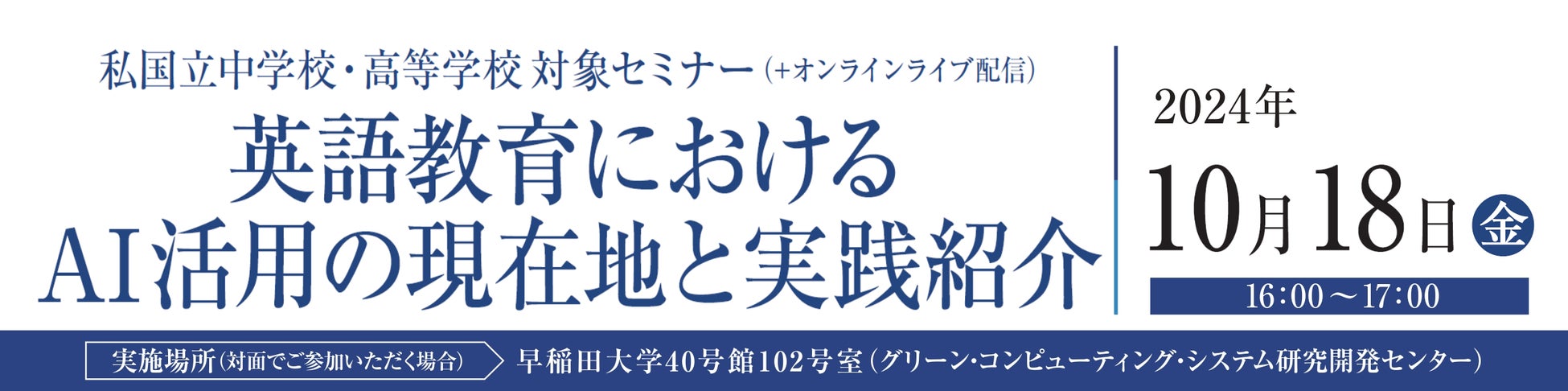 株式会社増進会ホールディングス(Z会グループ)のグループ会社で、教育機関の支援事業を行う株式会社エデュケーショナルネットワーク(本社:東京都千代田区、代表取締役社長:大久保忠志)は、2024年10月18日(金)に、私立・国立中学校・高等学校関係者を対象に、無料セミナー「英語教育におけるAI活用の現在地と実践紹介」を早稲田大学で開催します。