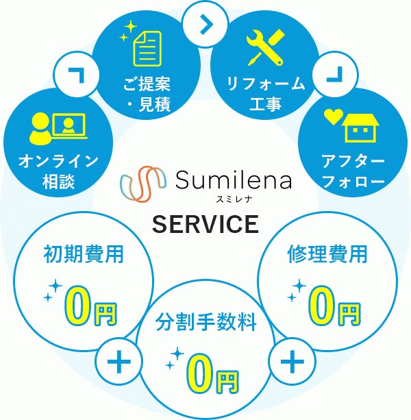 スミレナは東京ガス発のベンチャー企業として誕生したガス機器・水回りが得意なリフォーム会社です。分割手数料0円での分割払いという新しい形でのサービス、お客さまに徹底的に寄り添ったコミュニケーション、施工店との万全の連携によって、お客さまごとのライフスタイルに合わせた「納得・感動のリフォームプラン」を一緒に作り上げ、工事やご利用開始以降のお悩みまでしっかりサポートします。