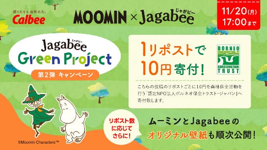 対象の投稿に対して1リポストあたり10円を森林保全活動支援のため認定NPO法人ボルネオ保全トラスト・ジャパンに寄付します。また、リポスト数に応じて、「ムーミン」と「Jagabee」のオリジナルデザイン壁紙も順次公開いたします。