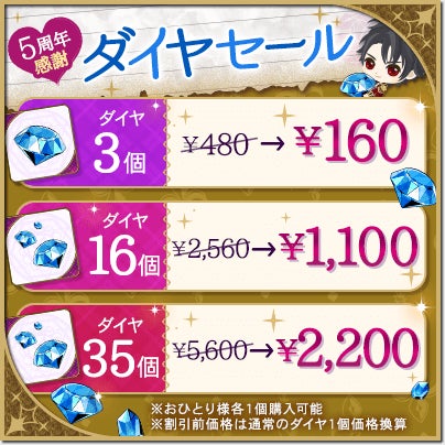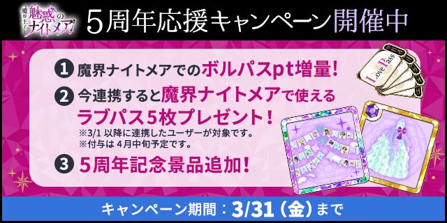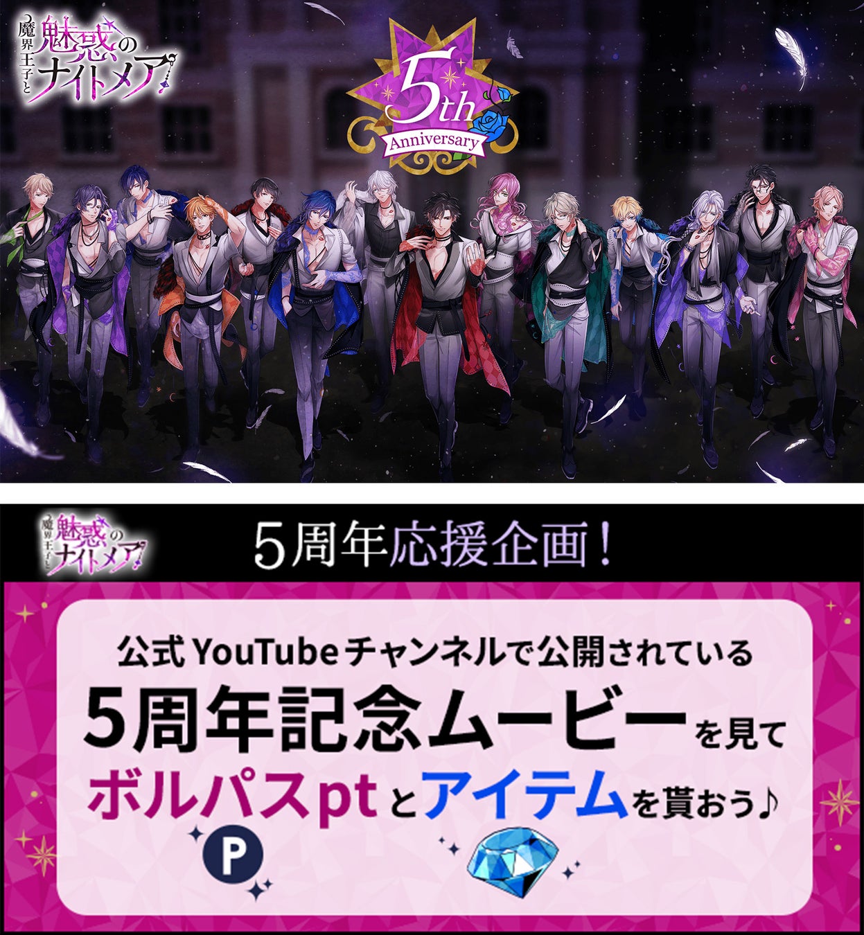 5周年を迎え、ますます盛り上がりを見せる 「魔界ナイトメア」。これからも美しき王子たちとの甘く、魅惑的なストーリーで皆様にトキメキをお届けしてまいります。