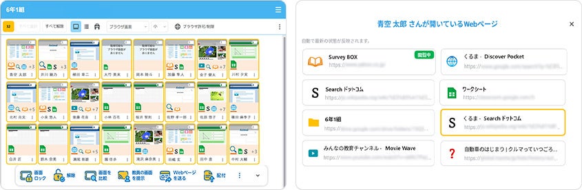 子どもたちが今どんなWebサイトにアクセスしているか、アイコン表示でひと目で確認できます。また、一人ひとりが開いているすべてのWebページの詳細の確認も可能です。その中から共有したいWebページを選んでほかの子どもたちに転送することもできます。