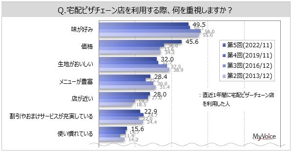 【宅配ピザチェーン店に関する調査】直近1年間に利用した人は3割強。利用時の重視点は「味が好み」「価格」が直近1年間利用者の各40%台。2019年調査と比べて「価格」が増加