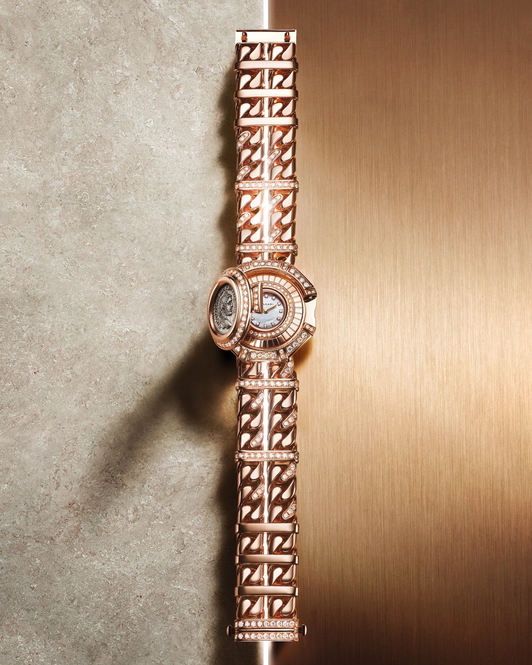 「モネーテ カテーネ」はチェーンブレスレット(イタリア語で「カテーネ」)とシームレスにつながっています。このカーブチェーンに宿る美しさは1940年代からブルガリが培ってきた創造性豊かなヘリテージの一部であり1960年代に作られた初代の「モネーテ」のジュエリーにも採用されています。「モネーテ カテーネ デュアルタイム」は、イエローゴールドと宝石をセットしたピンクゴールドのリンクを交互に配した5列に並んだリンクがあり、バゲットカットのダイヤモンドをあしらったホワイトゴールドのバーの輝きで魅了します。カーブチェーンのブレスレットは、ピンクゴールドのパーツの上にダイヤモンドが散りばめられています。