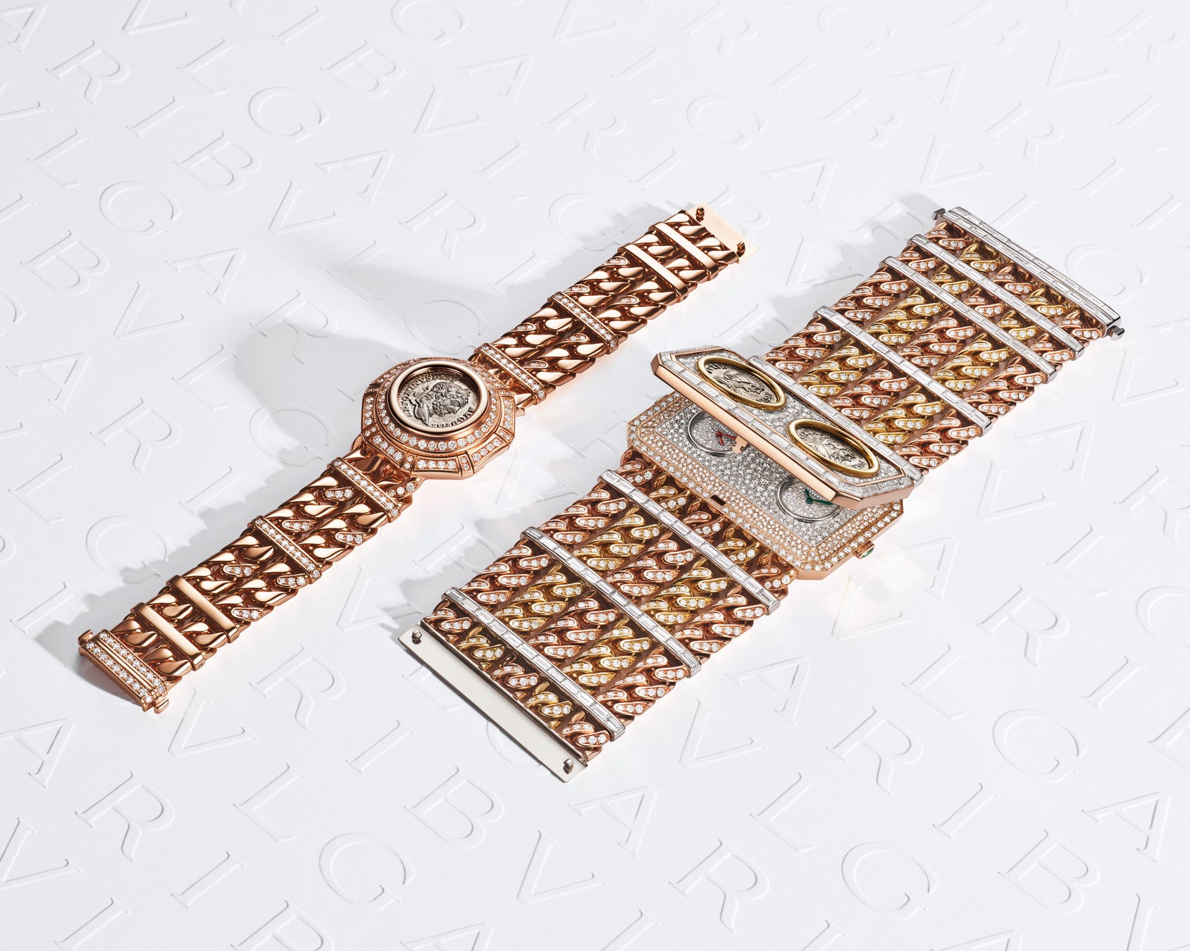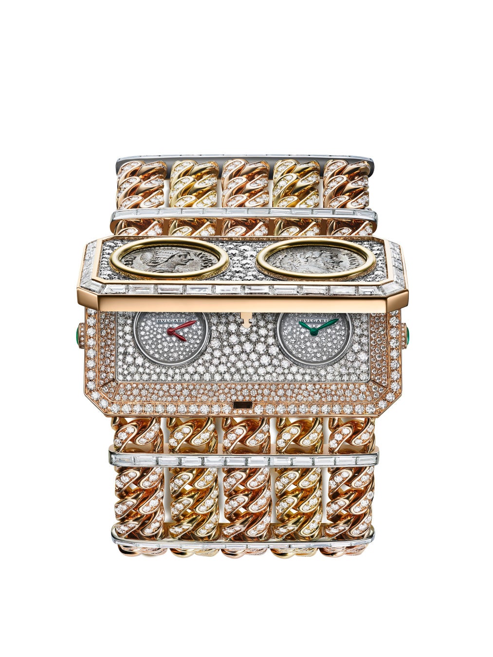 「モネーテ カテーネ」は洗練された魅力と卓越した美学によりゴールドとダイヤモンドで形作られた、重厚なボディを持つタイムピースです。そして巧みな技術で作られたケースに古のコインが収められています。「モネーテ カテーネ」のケースは、かつての「オクト モネーテ」のウォッチのように8つのファセットで構成されたデザインです。ブルガリが大切に守ってきた力強い象徴性を持つこの幾何学的な形はローマにあるマクセンティウスのバシリカの天井を思い起こさせます。同じく洗練されたデザインの「モネーテ カテーネ デュアルタイム」は1970年代にローマン メゾンがデザインした長方形の時計からインスピレーションを得ています。2色の針を配した2つのダイヤルが異なるタイムゾーンの時刻を表示します。コインを取り囲むイエローゴールドとピンクゴールドの組み合わせは当時の特徴でもあった2つのトーンの輝きを表現しています。ジュエリー作りの専門技術が詰め込まれたこのウォッチにはバゲットカットとブリリアントカットのダイヤモンドがあしらわれ、繊細なスノーセッティングが施されています。ケースの側面にはブルガリの証である2つのカボションカットのエメラルドが配されておりこの「鍵」でケースを開けると、中に隠れていたダイヤルが輝きを放ち姿を現す仕組みです。