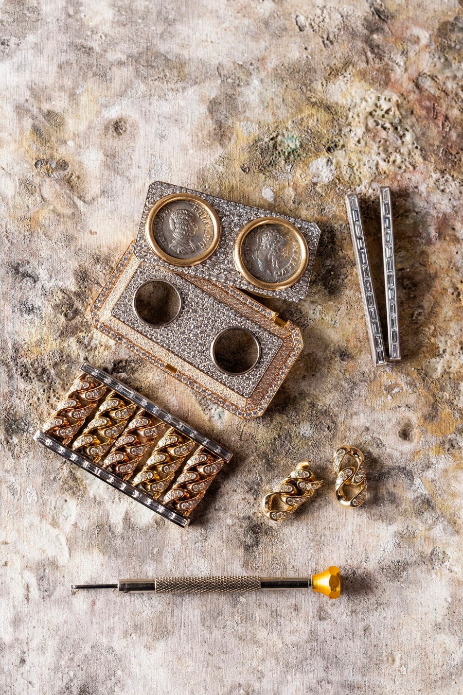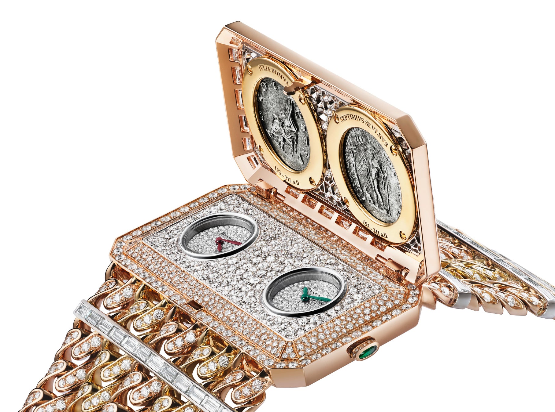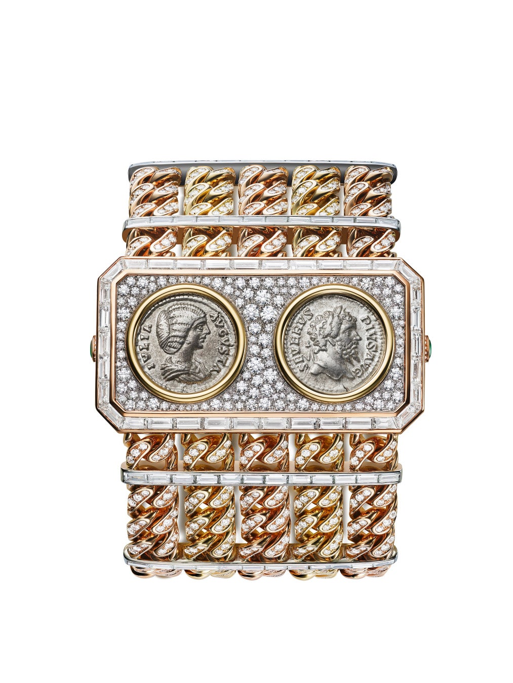 ケース/ブレスレット/ダイヤル:ピンクゴールド/イエローゴールド/ホワイトゴールド製、バケットカットダイヤモンド(約21.76ct)、ブリリアンカットダイヤモンド(約20.8ct)、セプティミウス・セウェルス皇帝(193-211AD)と皇妃ユリア・ドムナ(193-217AD)のデナリウス硬貨がセットされたケースカバー、2石のエメラルドカボション(約0.12ct)