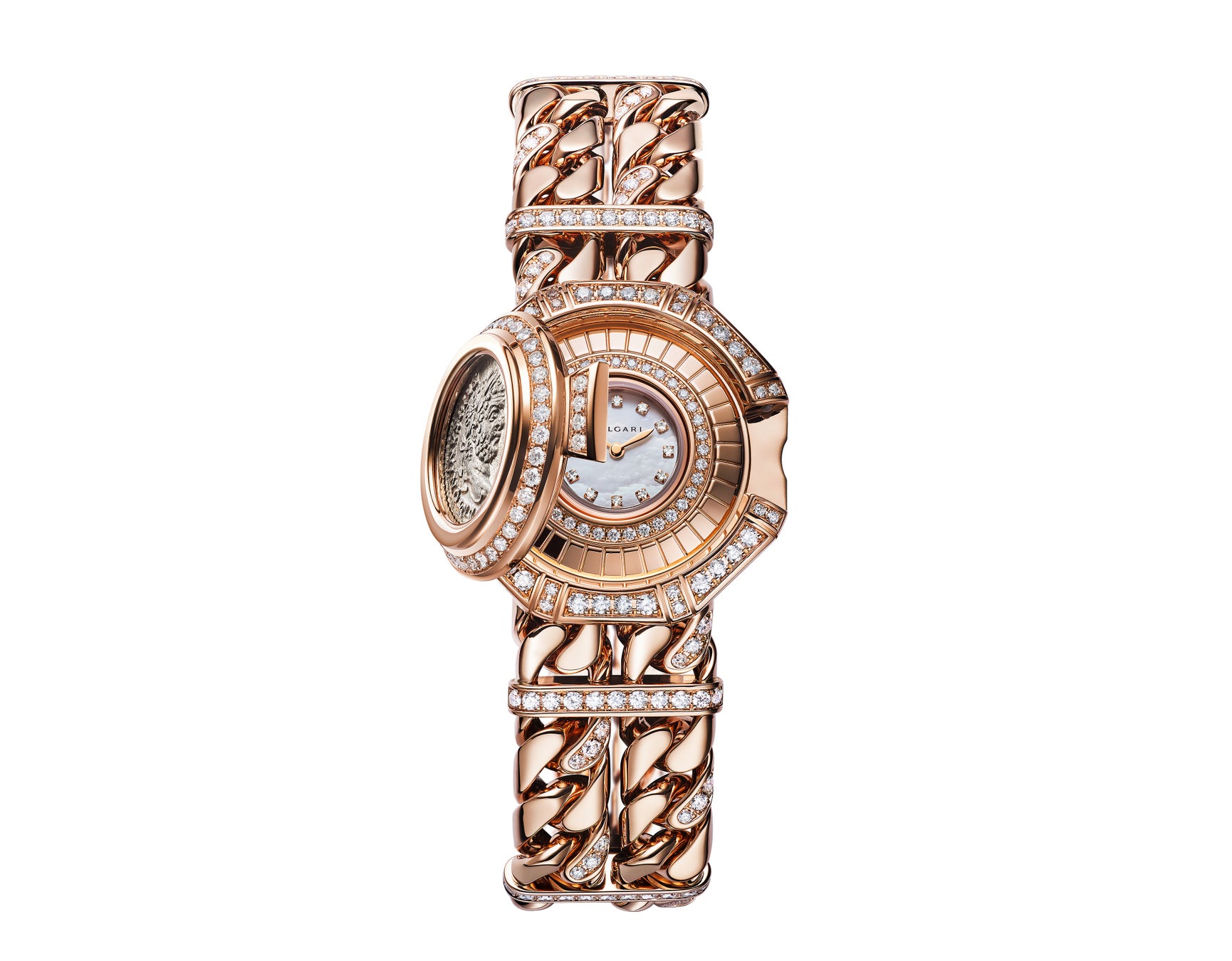 ブルガリのマニュファクチュールが小型化の技術の粋を結集して製作したムーブメント、ピコリッシモBVL100は「モネーテ カテーネ」を唯一動かすことのできる世界最小の円形ムーブメントとしてこのタイムピースの心臓部に搭載されています。同じく機械式のムーブメントを搭載していた過去の時代のジュエリーウォッチを彷彿とさせる、手巻きのキャリバーです。このさりげなさのある美しさを極限まで高めたタイムピースの傑作には古代の強力なシンボルであり時を超えて豊かな歴史を今に引き寄せる金貨を中心にブルガリのハイジュエリーとオートオルロジュリーの専門知識が詰め込まれています。